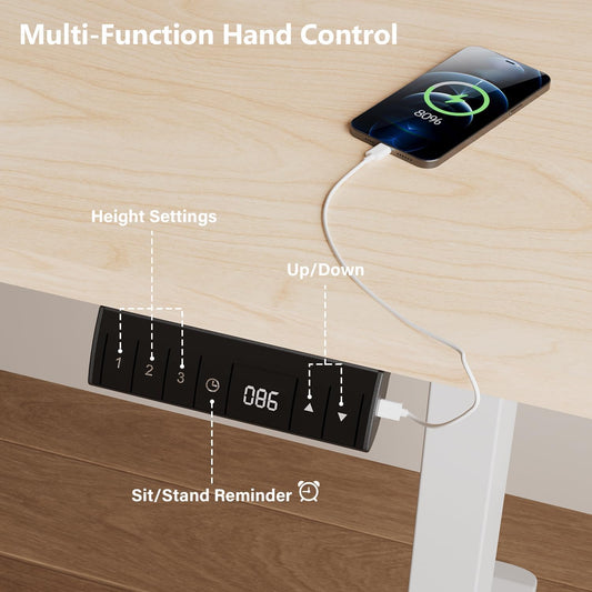 Electric Standing Desk 160x80cm with USB Charging Sit Stand Reminder Height Adjustable Desk, Stand Up Home Office Desk with 3 Memory Functions and Hook, Cable Management Tray, Maple