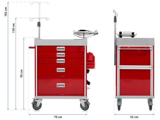 Emergency trolley 5 drawers, cardiac board, oxygen tank holder and IV stand support