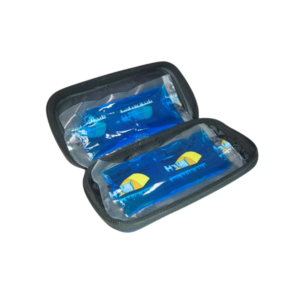 Hard backed zip up personal insulin pen pack carrier. Durable dark navy cover, net zip up pouch inside to hold product, cooling gel pack, dividing board and several elasticized loops for holding pens. -Keeps temperature between 2 - 10 degrees for 5 hours at ambient temperature 35 degrees -Comes with 2 packs of Soft Gel pack -Approx Weight with gel pack 500g -Great when traveling in hot climates, and for going out and about -Fit snugly into jacket pocket or handbag. -Ideal for insulin pens, Biologics, eye drops, and vials. Usable cold space 190x100x35 mm (Insulin 3x10 ml vials/2 x disposable insulin pens/Syringes 3/blood glucose monitor x 1)
